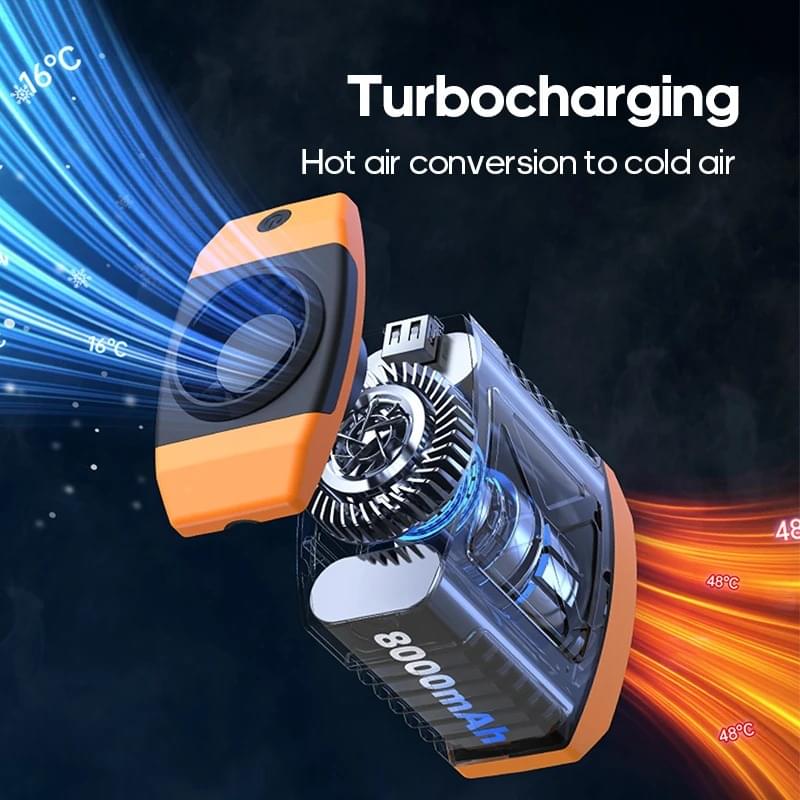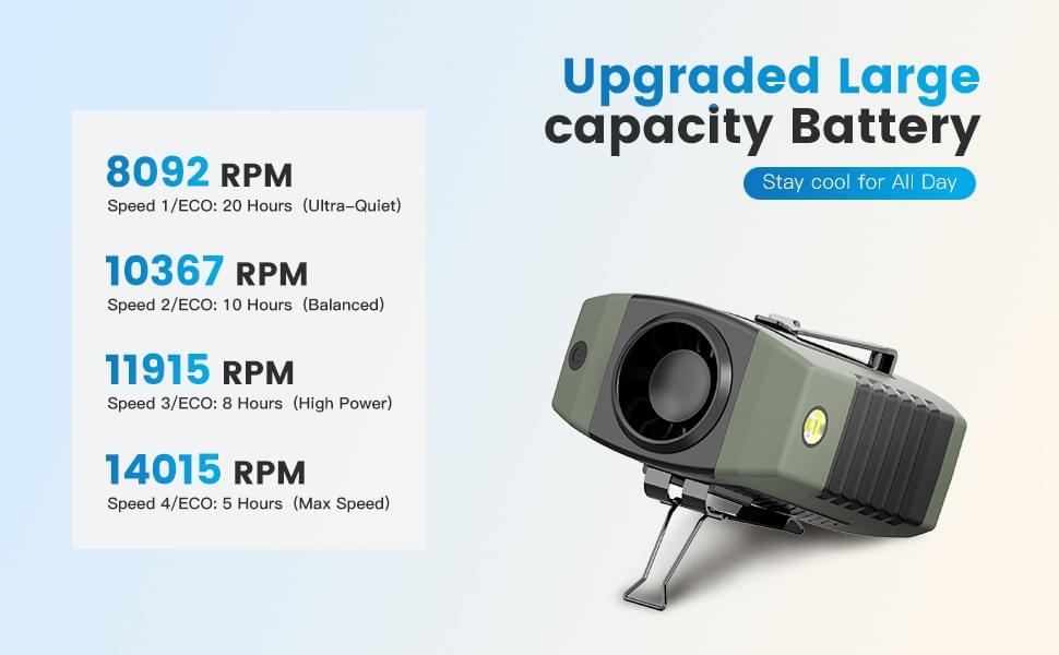 • All-Day Cooling Power: The built-in 8000mAh battery gives you 5.5–21 hours of continuous use depending on the speed. Perfect for full shifts, outdoor events, and travel days.