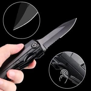 Blades can be dangerous and you can easily cut yourself without proper care. In order to make the multi-tool pocket knife safer to handle, has included an ingenious safeguard that prevents the blade from accidentally closing on your fingers by requiring you to push inwards to fold it.